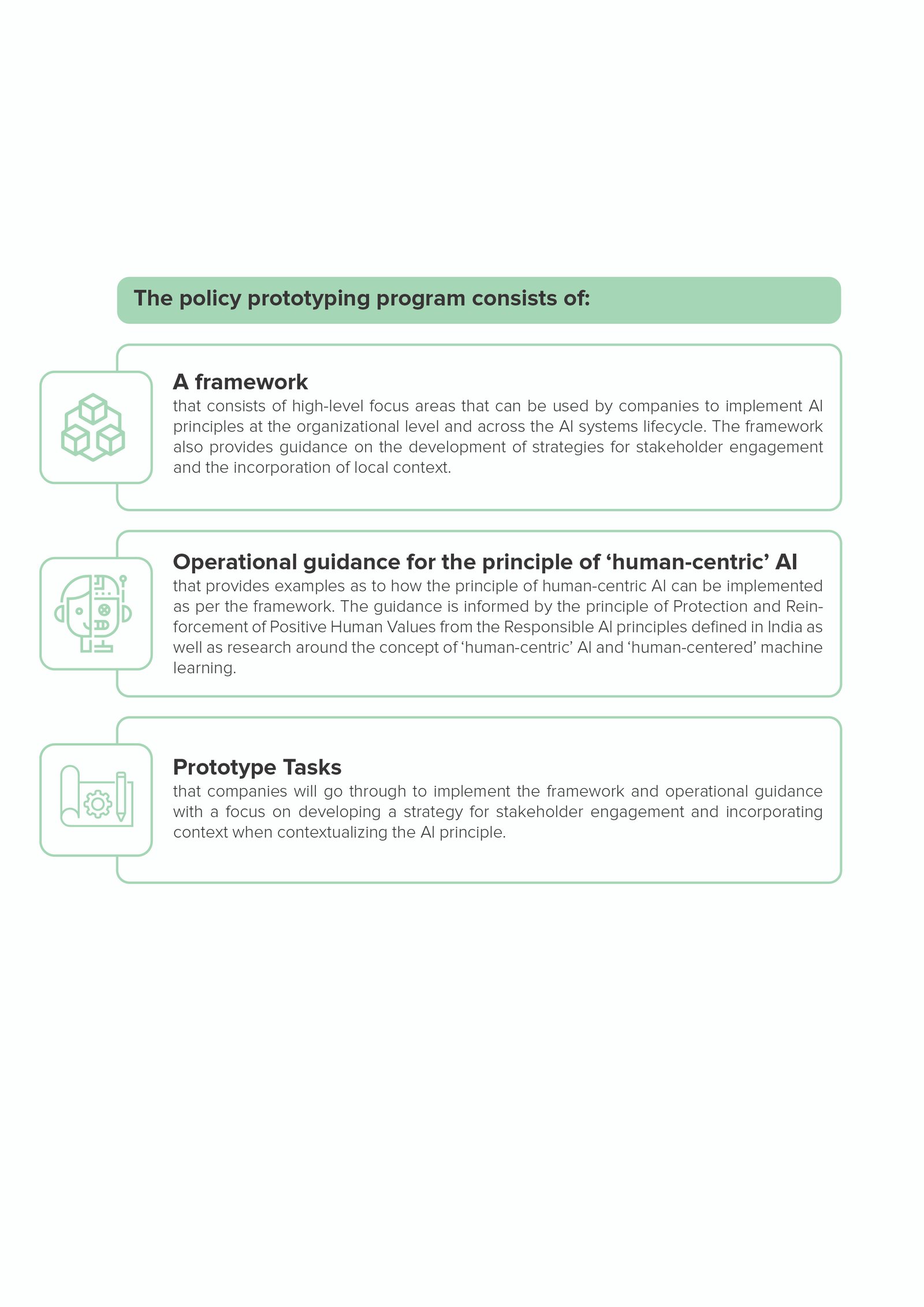 The program will follow the policy prototyping methodology developed by Open Loop. In particular, the Open Loop consortium will test a framework and operational guidance (which together form the “policy prototype”) for identifying and incorporating community voices and accounting for local realities across the AI systems lifecycle with AI companies in India. Through this methodological approach, we will produce a report with policy recommendations based on the experience of participants in receiving, handling and implementing the policy prototype, to test its clarity, effectiveness and actionability.