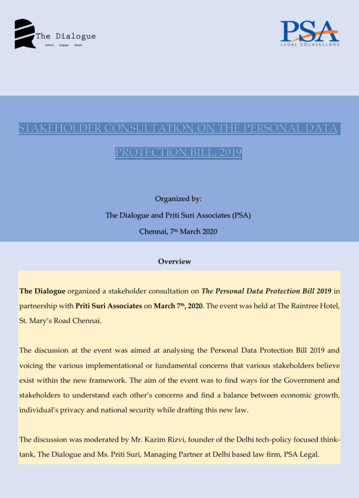 On March 7, 2020, The Dialogue, in partnership with PSA Legal, hosted a stakeholder consultation on the Personal Data Protection Bill 2019 at The Raintree Hotel, Chennai. The event brought together key players from diverse industries to analyze the Bill and address its potential challenges. Moderated by Kazim Rizvi, Founding Director of The Dialogue, and […]